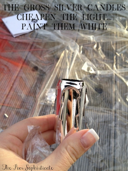 On any old or faux chandelier, I recommend painting the silver or dirty yellow candlesticks white to freshen them up... you guys, it really makes a HUGE difference in appearance and also makes the piece look more authentic.
