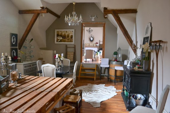 Here is a little reminder of what our (rental) barn dining room looked like before we changed out the light fixtures, painted, and created a pallet wine bar...